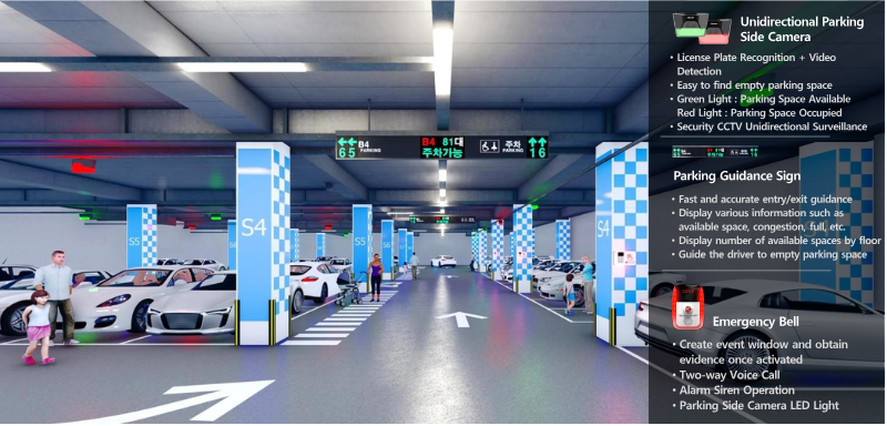 - Parking video guidance, location, check, and security monitoring services provide for the designated parking area for custimers using 5~12-megapixel unidirectional camera