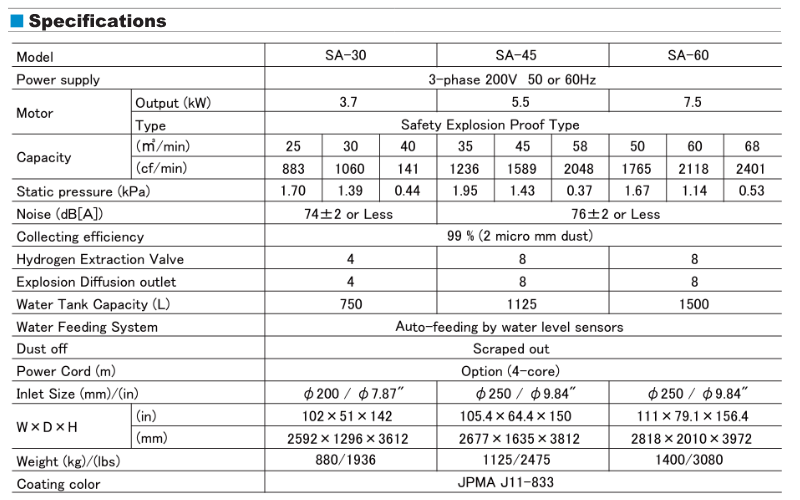 Scrubber type dust collector. Easy maintenance with no tools needed. SA employ pressure diffusion vent, check valve, drain and can collect for Mg & AL powder.