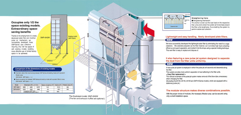Pulse jet dust collector that provide large airflow capacity and efficiency. SNP can be installed in small area because SNP filter are plate filters and installed horizon to SNP dust collector.