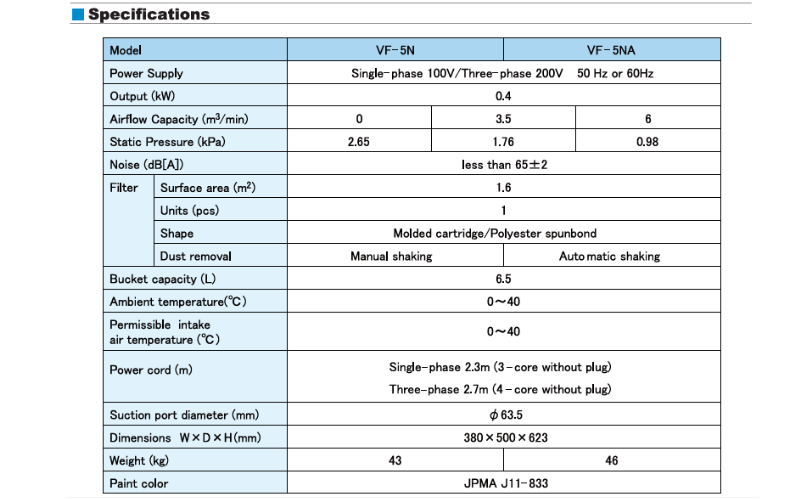 Compact general purpose dust collector. This dust collector has small output generates high-volume airflow while producing very low running noise. Filter is cleaned by shaker (Auto shaker type is VF-5NA). Filter have wide filtering area.